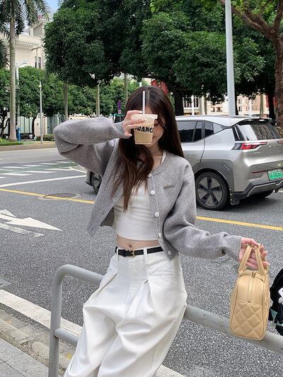 2024 秋冬トップス カーディガン ニット セーター ラウンドネック ボタン 長袖 丈短め 細見え 秋 グレー おしゃれ かわいい 韓国ファッション レディース お出かけ
