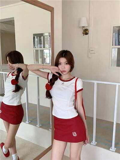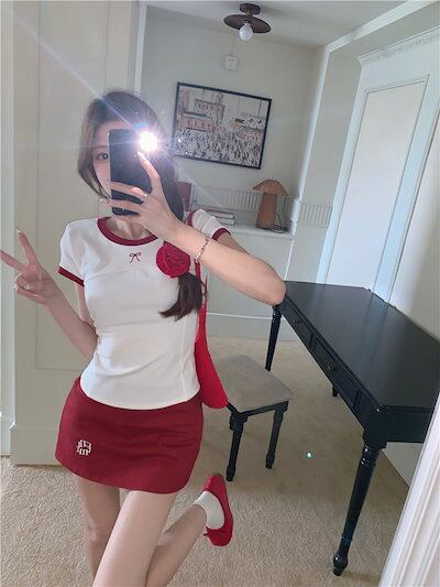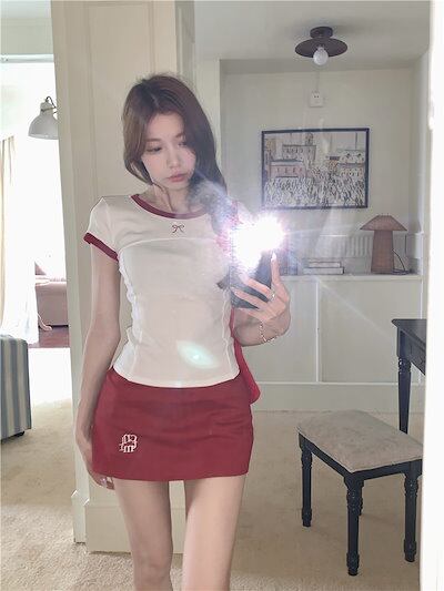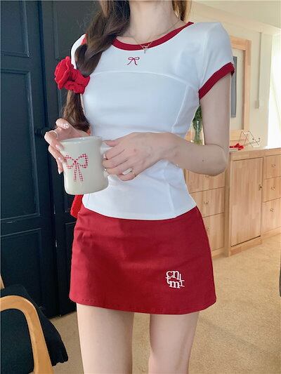 2024 春夏 甘い トップス Tシャツ ラウンドネック丈 休日 フレンチ プリント 韓国 ファッション系 タイト スリムフィット丈短め半袖ミックスレディースサイドへそ出しバイ休日おしゃれT