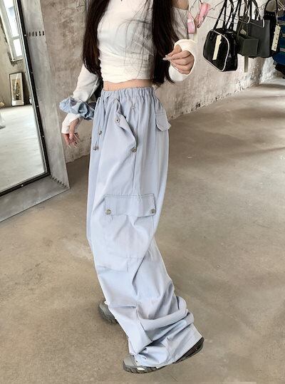 2024 夏パンツ ロング丈 ワイド ストレート サイドポケット ハイウエスト 美脚効果 脚長効果 細見え 夏 水色 白 おしゃれ かわいい 韓国ファッション レディース お出かけ