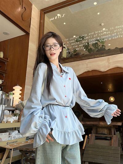 2024夏トップス シャツ 長袖 ボタン 襟 スタンダードカラー ハート キャンディスリーブ ゆったり 細見え 夏 水色 ライトブルー おしゃれ かわいい ガーリー キュート 甘め 韓国ファッション