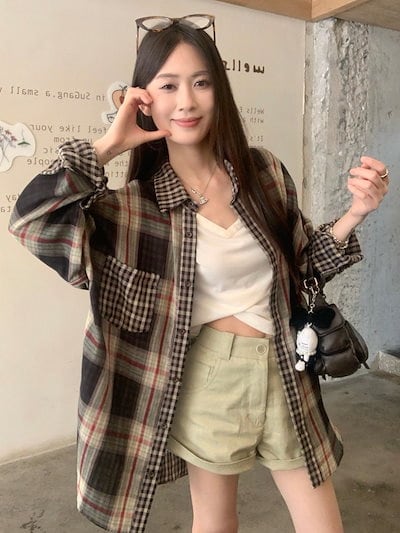2024夏トップス シャツ 長袖 ボタン 襟 チェック柄 大きめサイズ 丈長め ゆったり 細見え 夏 茶色 ブラウン おしゃれ かわいい 韓国ファッション レディース お出かけ