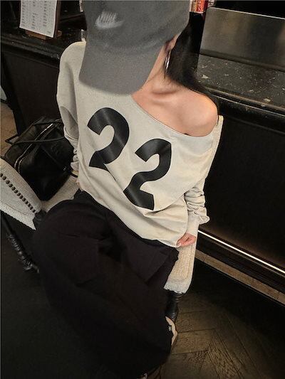 2024 秋冬トップス 長袖 数字 22 肌見せ ゆったり 細見え 秋冬 グレー おしゃれ かわいい 韓国系ファッション レディース お出かけ