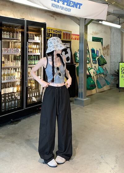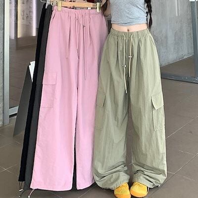 2024 春夏パンツ ロング丈 サイドポケット ウエストゴム ワイド ストレート ハイウエスト 美脚効果 脚長効果 細見え 夏 黒 緑 おしゃれ かわいい 韓国ファッション レディース お出かけ