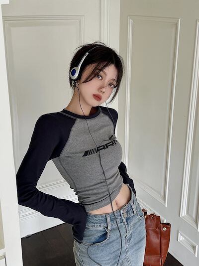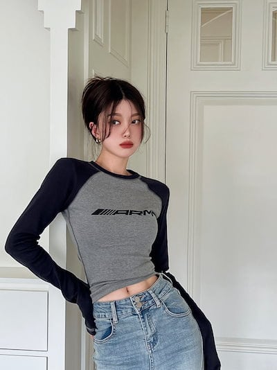2024春夏 トップス 長袖 可愛い おしゃれ タイトフィット カットソー ラウンドカラー 重ね着丈 スリーブ 女っぽ レディース Tファッション系 フェミニン きれいめ 色っぽ プリント