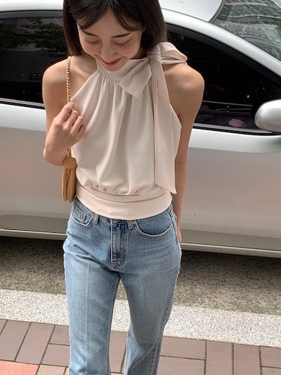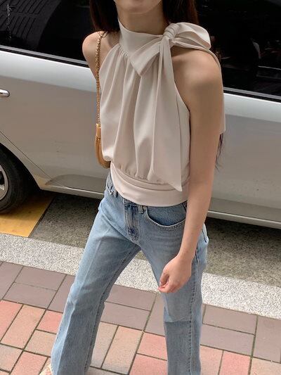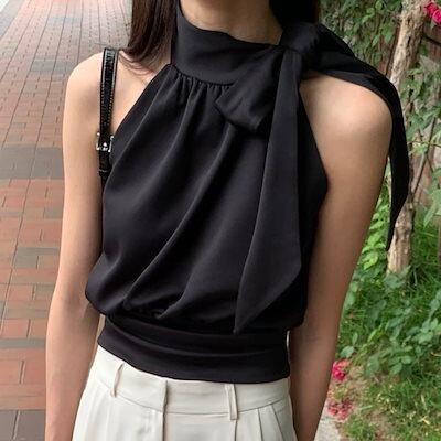 2024 夏 韓国トップス シャツ ホルターネック ノースリーブ リボン ゆったり 細見え 夏 白 黒 紫 おしゃれ かわいい 韓国ファッション レディース お出かけ