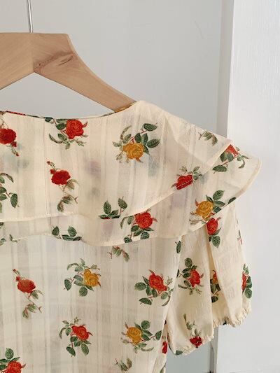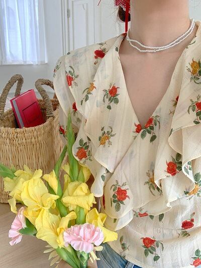 2024 夏 韓国トップス シャツ Vネック 花柄 赤い花 半袖 ゆったり 細見え 夏 キュート 甘め おしゃれ かわいい 韓国ファッション レディース お出かけ