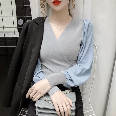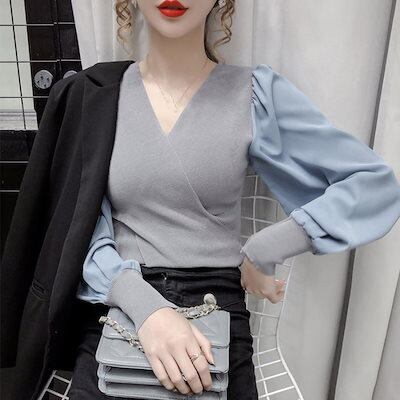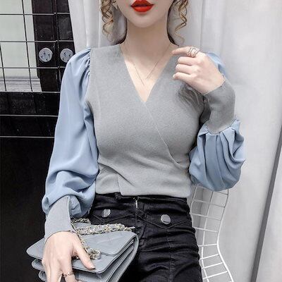 バルーン袖 リブニットトップス 韓国風 シフォン アンダーウェア