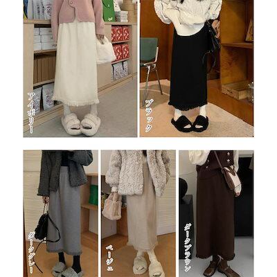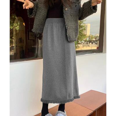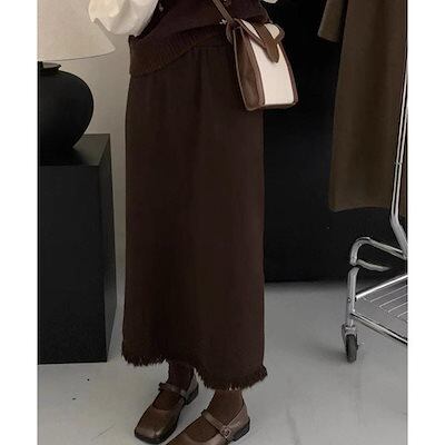 【 3日で出荷 】ハーフスカート ロングスカート 裾フリンジニットスカート