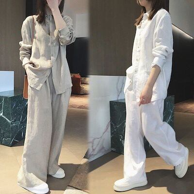 綿麻スーツ 2024韓国版ファッション セットアップ カジュアルスポーツジャージ ワイドパンツ レディース 2枚セット