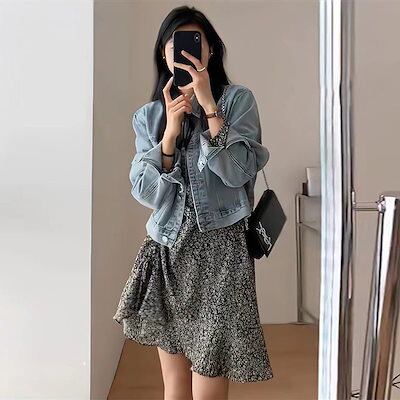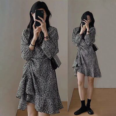 フレンチアシンメトリーVネック 花柄 ワンピース レディース デザイン感 早秋 韓国ファッション 大きいサイズ