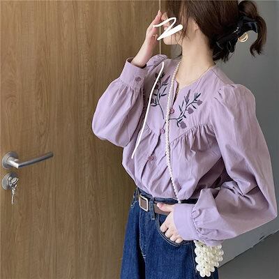 2024秋の新作 今っぽシアーシャツ レトロ 刺繍 ブラウス Tシャツ トップス ゆったりVネック シャツ 通勤 上品