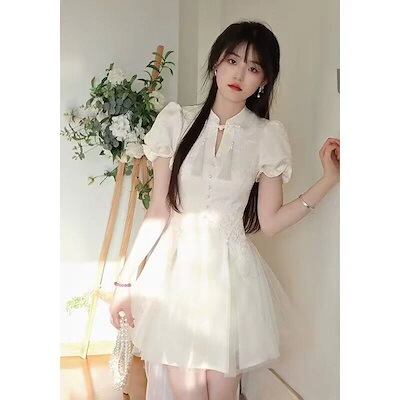 新作 かわいい ドレス チャイナドレス レディース 改良 着痩せ チャイナ風 ワンピース フリンジ バブル袖 ウエスト引き締め ショートドレス