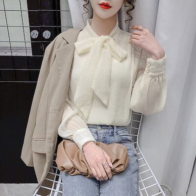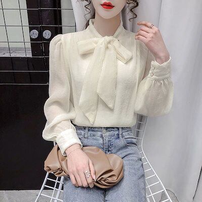 人気 長袖ブラウス 韓国OL 通勤 フレンチ 蝶ネクタイ ひらひらベルト Tシャツ着痩せ長袖 シフォン/トップス/ブラウスtシャツメ レディース トップス 初秋