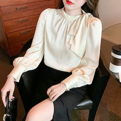 長袖ブラウス新作 秋 蝶ネクタイ サテンブラウス レディース スタンドカラー フリル 長袖 トップス