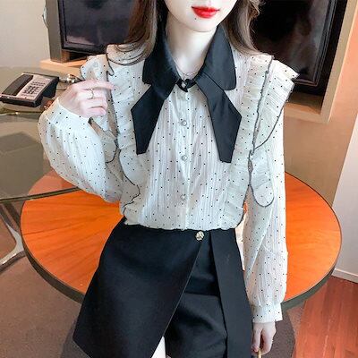 ポルカドット長袖ブラウス 2024 秋 新しいスタイル ラッフル リボンタイ ポルカドット 長袖 シャツ レディース ブラウス