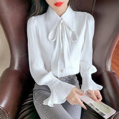 今っぽシアーシャツ フレア 長袖 シャツ レディース 春秋 2024 新しいスタイル プリーツ 蝶ネクタイ シフォン トップス