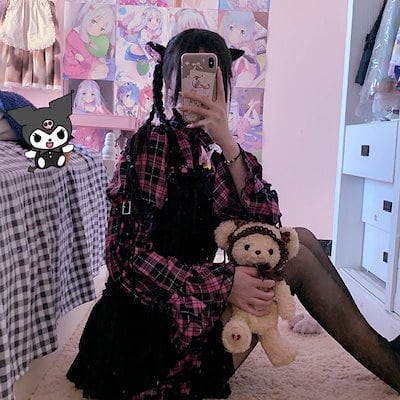 ロリータ ワンピース ロリータ 二次元 黒紫ロック猫jkチェック少女取り外し可能袖フリルワンピースop