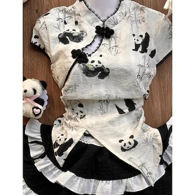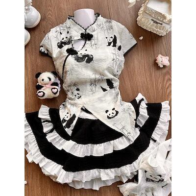 ロリータ ワンピース 2024 新作 二次元学 院祭用 人气 可愛い少女 3点セット パンダプリントトップスケーキスカートメイドエプロンセット