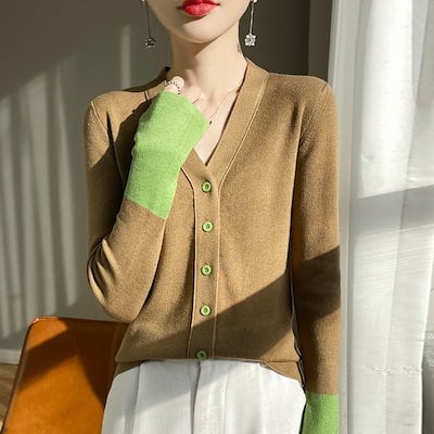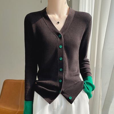 【Qoo10最安値挑戦!!!】 秋の新作フレアスリーブパッチワークカラー 長袖 Vネックカーディガン レディース 快適 アウター通勤