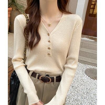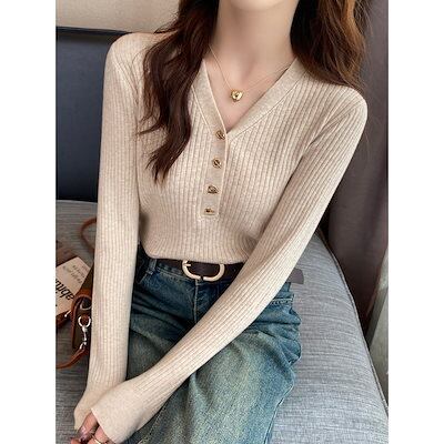 Vネックプルオーバーインナー2024新作秋ファッション 長袖ニット セータートップス