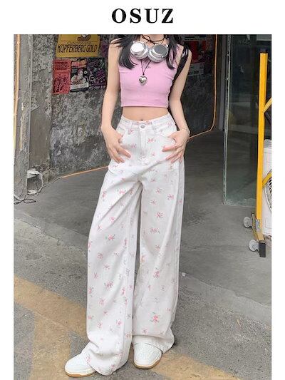 大人気 デニムパンツ 秋 新作 パンツ デニム ジーンズ 花柄 ピンクの花 ワイド ストレート ハイウエスト 細見え 春 白 ホワイト カジュアル ファッション お出かけ レディース 脚長効果 美脚効
