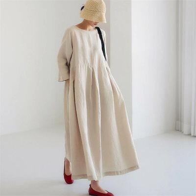 2024新作 半袖Vネック ーブ大きめサイズワンピース ロングワンピー リネンワンピースワンピース 母の日のプレゼント
