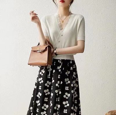 2024新作 シンプル Tシャツ 半袖 レディース ロングTシャツ ニットカーディガン 百掛け Vネック