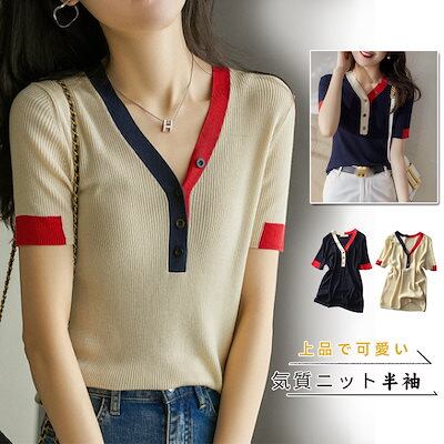 2024新作 高級感 シンプル インナー りトップス ニット Tシャツ Vネック半袖