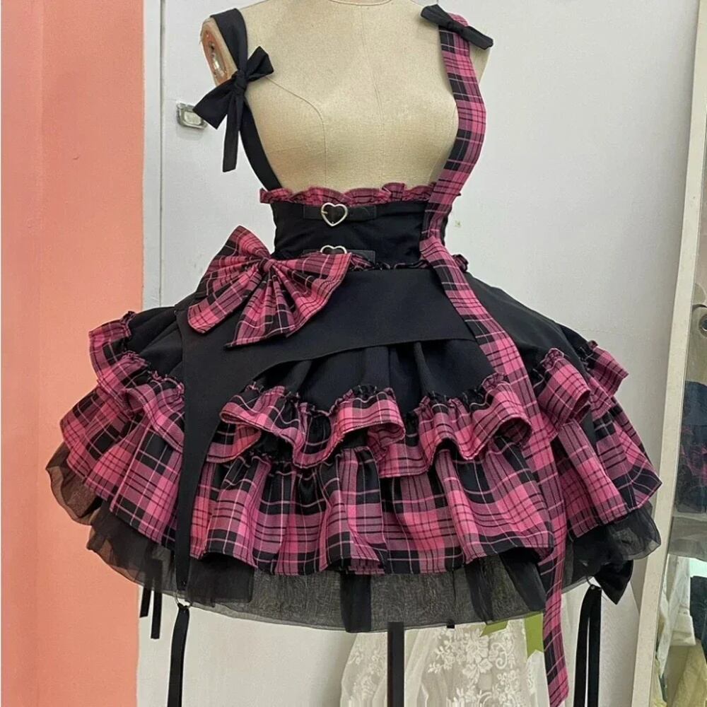女性の市松模様の弓のサスペンダースカート,空中ブランコのミニスカート,ロリータのボールガウン,かわいい女の子y2kコスプレコスチューム,愛のボタン,2021 T240925141336_02