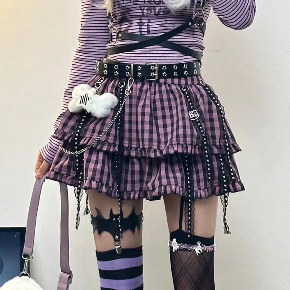 女の子のための日本の市松模様のミニドレス,女の子のための短いゴシックスカート,カワイイロリータサブカルチャー,パンクパープル,レイヤードケーキ,夏,2024 T240925141348_01