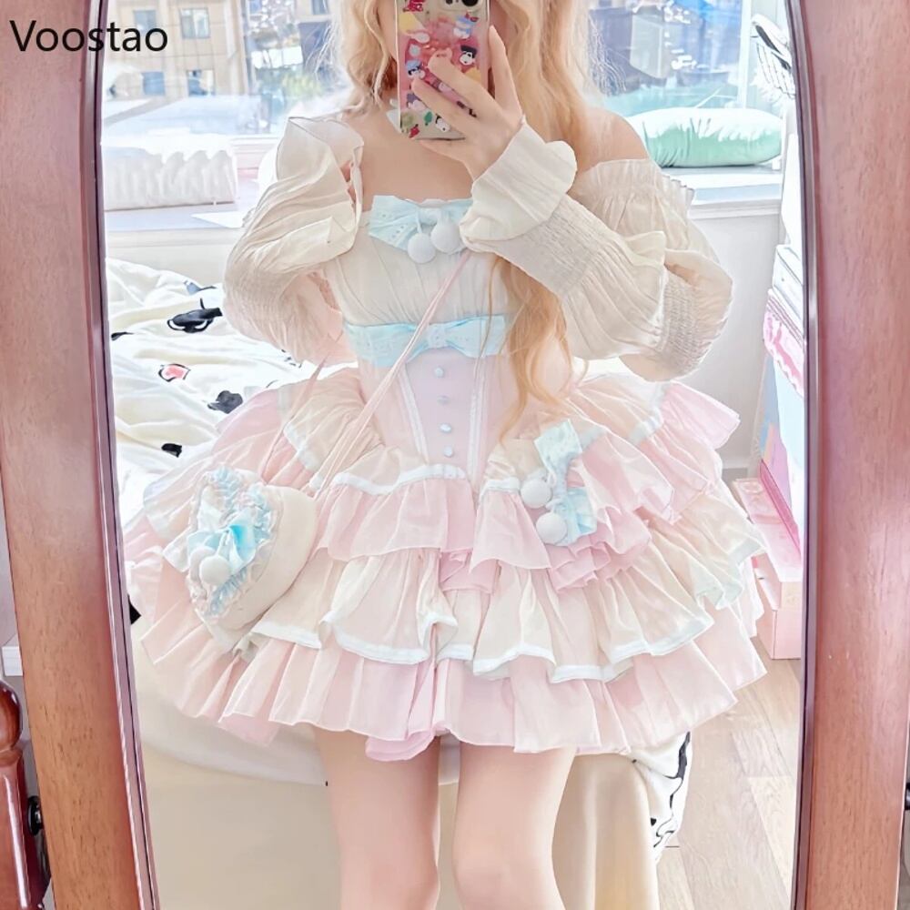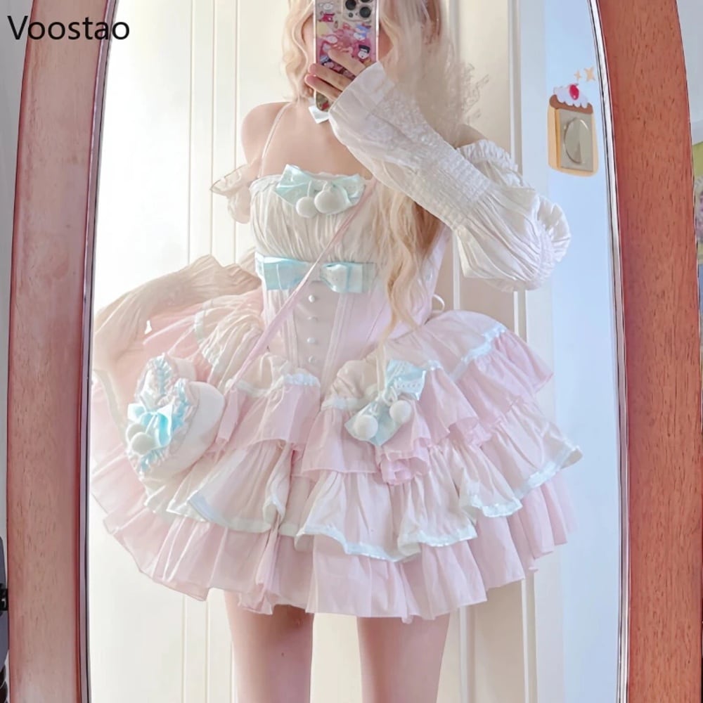 女性用ショルダーレスロリータ服,日本製ランジェリー,原宿カワイイ,レース,リボン,フラウンス,イブニングパーティー,スウィート T240925141441_01