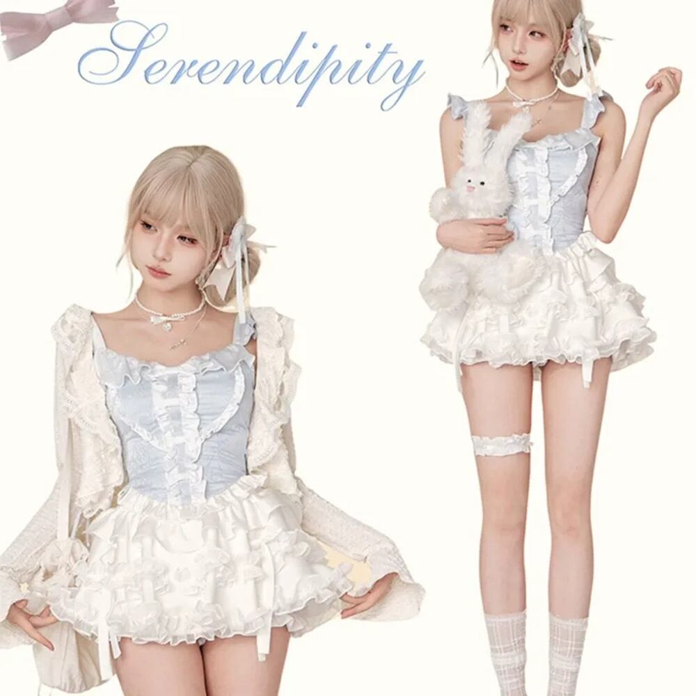 ロリータ長袖3ピースセット,無地のタンクトップ,かわいいハイウエストのプリーツティアードスカート,エレガントな婦人服 T240925141519_01