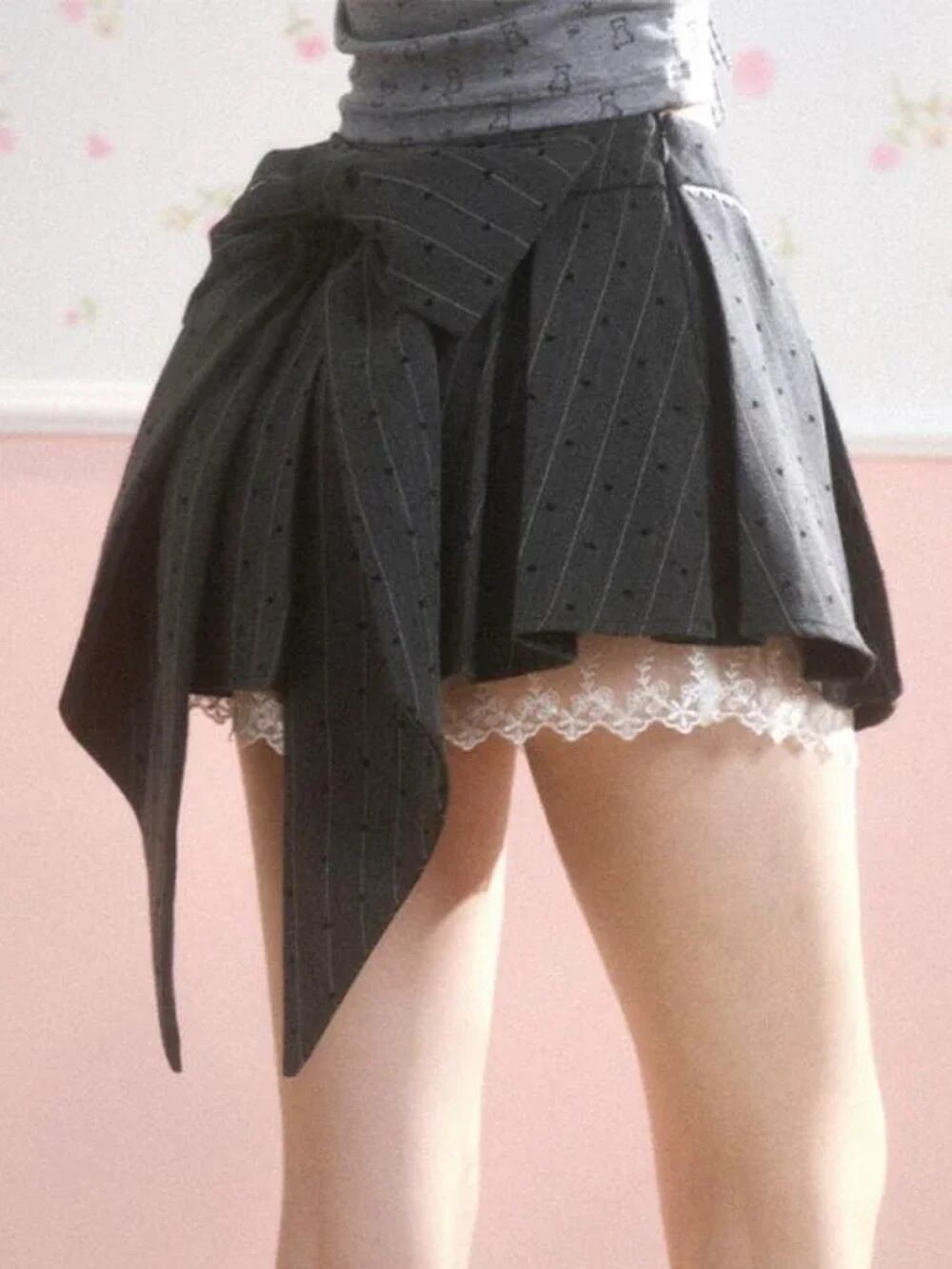 女性用グレープリーツミニスカート,レースパッチワークボウ,ロリータスタイル,ストライプドットプリント,新しいファッショナブルな夏のスカート,y2k,2024 T240925141617_02