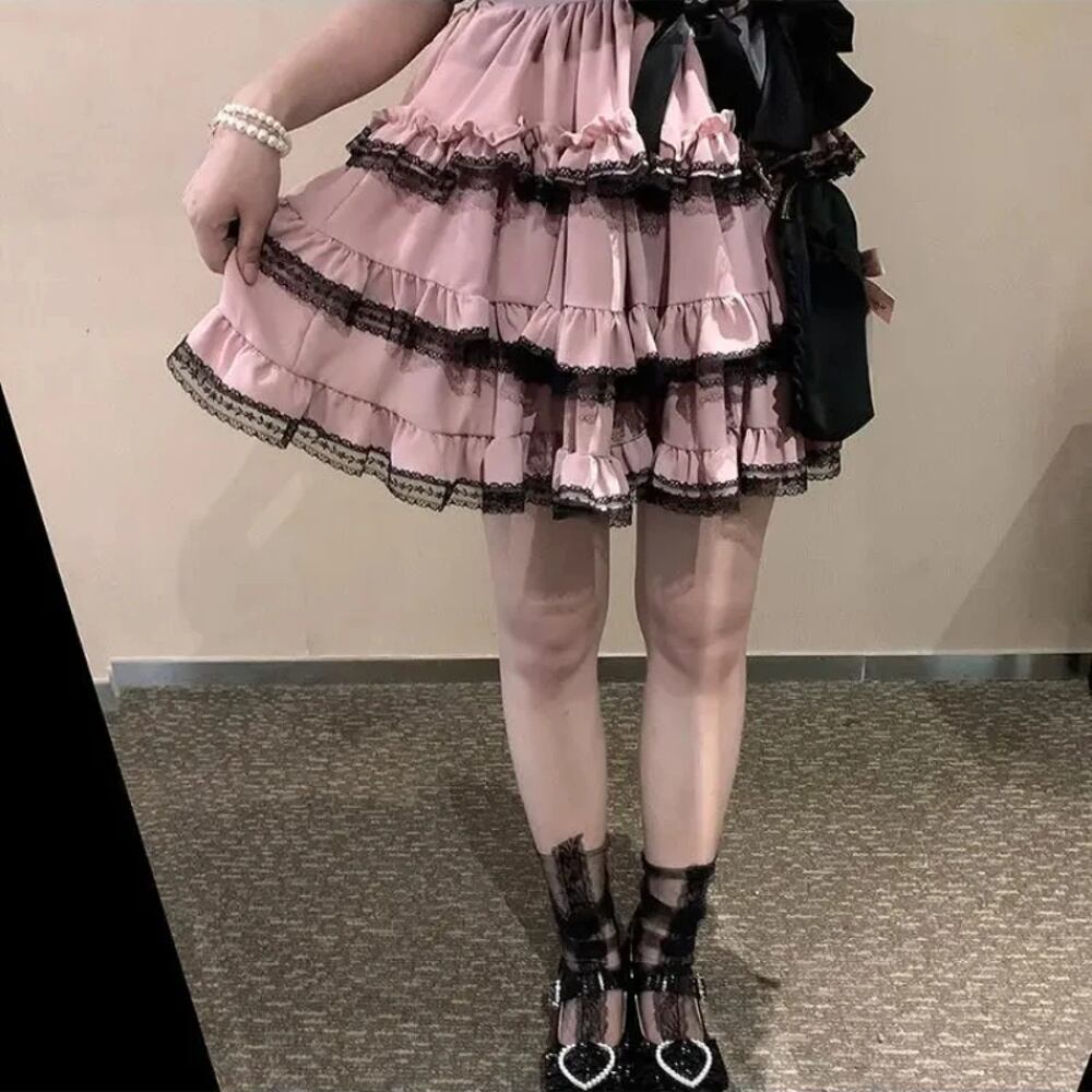 女性のための日本のカワイイミニケーキスカート、ブラックカジュアル、エレガントなロリータ、セクシーなハイウエストレース、美的、甘い、ゴシック、夏、y2k T240925141631_02