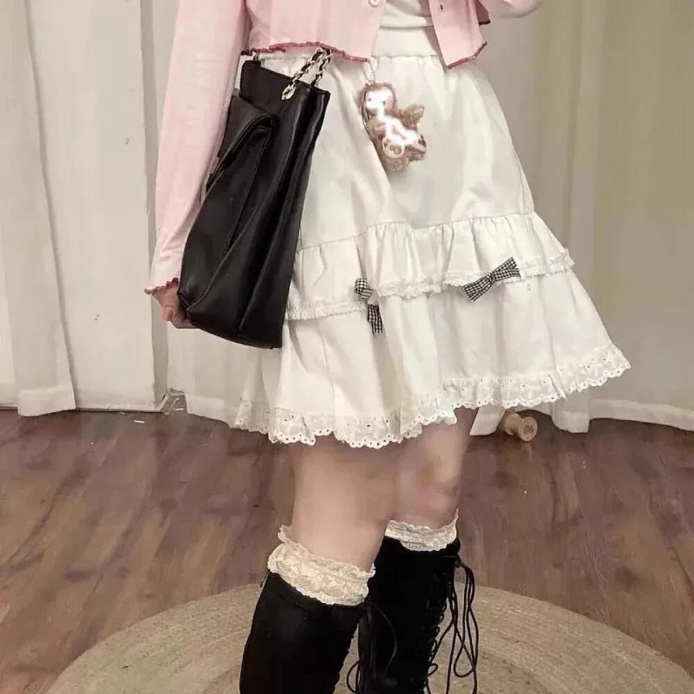 女性用和風カワイイロリータスカート,市松模様のショートスカート,伸縮性のあるウエスト,空中ブランコカット,レースパッチワーク,ミニフリル,黒と白,2024 T240925141637_02