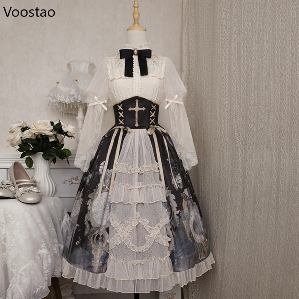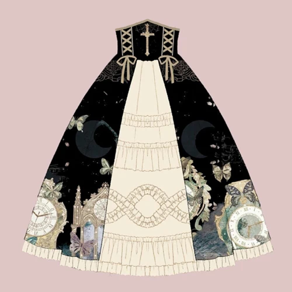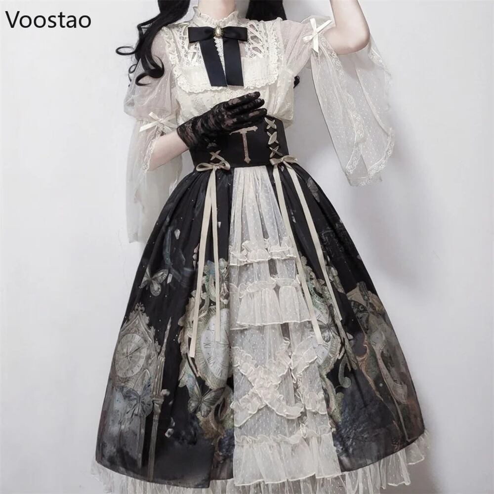 ヴィンテージゴシックロリータドレス,レース,エレガント,シック,レース,メッシュ,バタフライプリント,プリンセス,セット,女性用 T240925141716_02