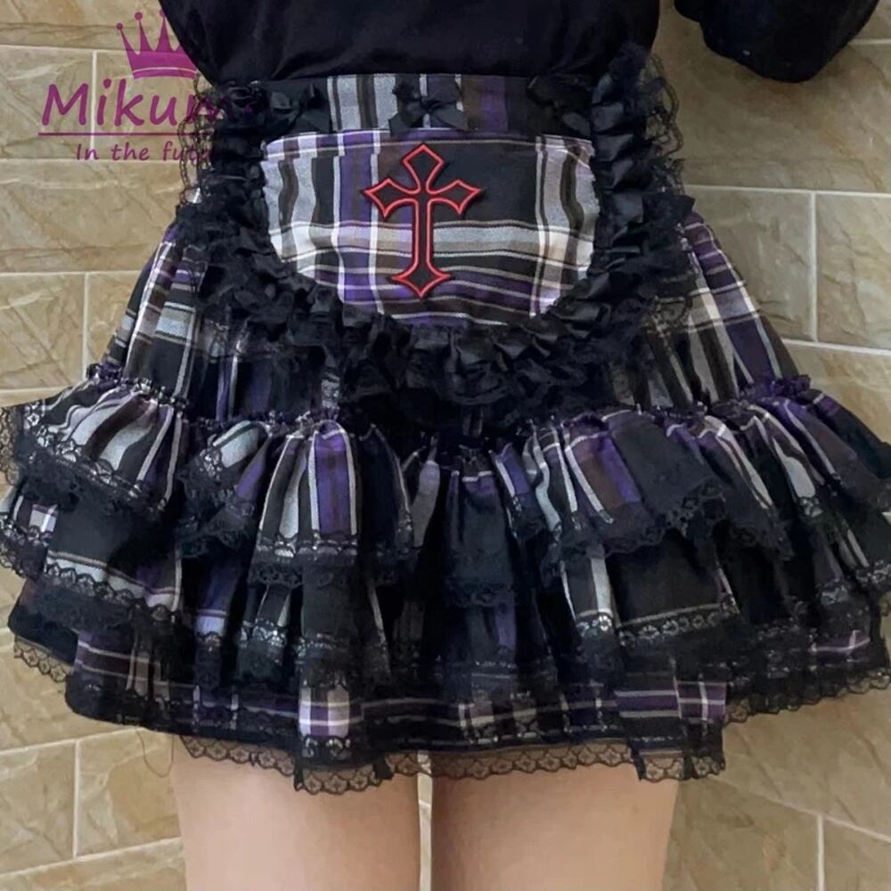 Mikautumn-女性用の市松模様のレースアップクロスレースエプロンショートスカート、カワイイ、ゴシック、ロリータ、ゴシック、パンク、女の子、ケーキ、ボールガウン、y2k T240925141730_05
