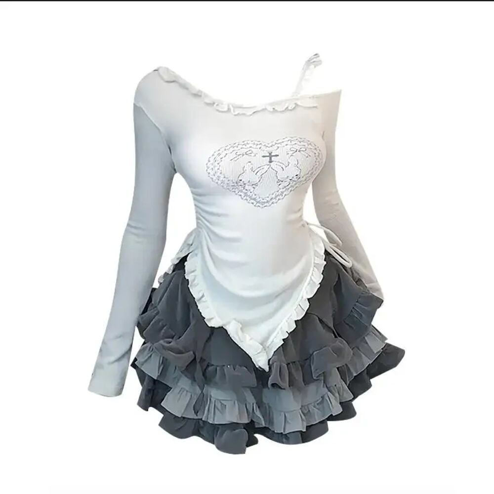 Gyaru-女性用日本の長袖ショートトップとミニスカート,カワイイ衣装,ライン、ロリータ,y2k,2ピースセット,p627 T240925141933_02