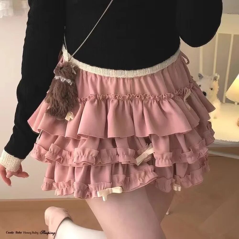 女性の原宿ケーキミニスカート,フリル,日本のカワイイ,ロリータ,レイヤードボウ,ポンポン,コスプレ,ピンク,ふわふわ T240925142136_01