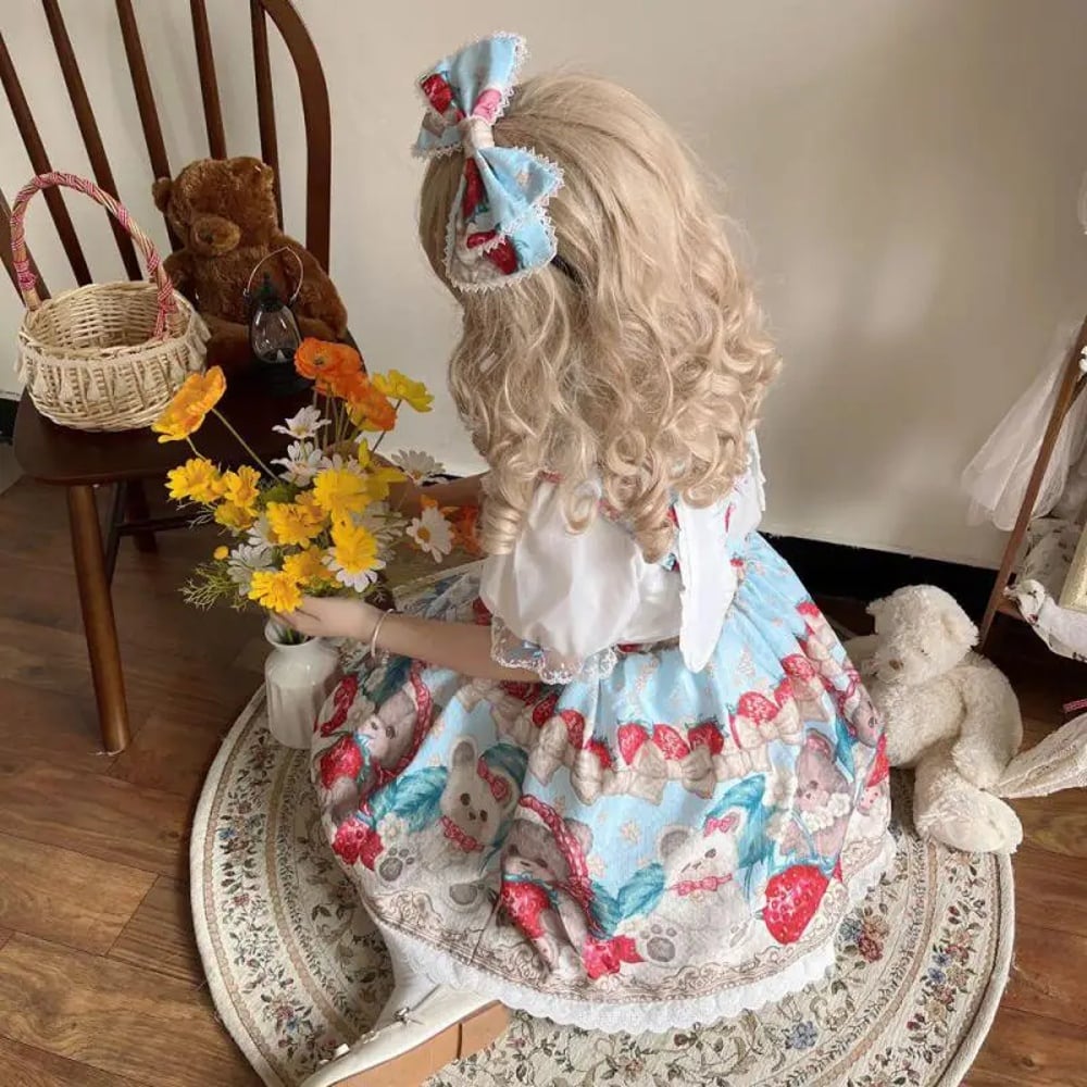 ピンクの柄が付いたプリンセスドレス,原宿カワイイ,ロリータ,コスプレ,姉妹,かわいいウサギ,イチゴ,ノースリーブ,sk,フリル,弓,チュチュ T240925142335_03