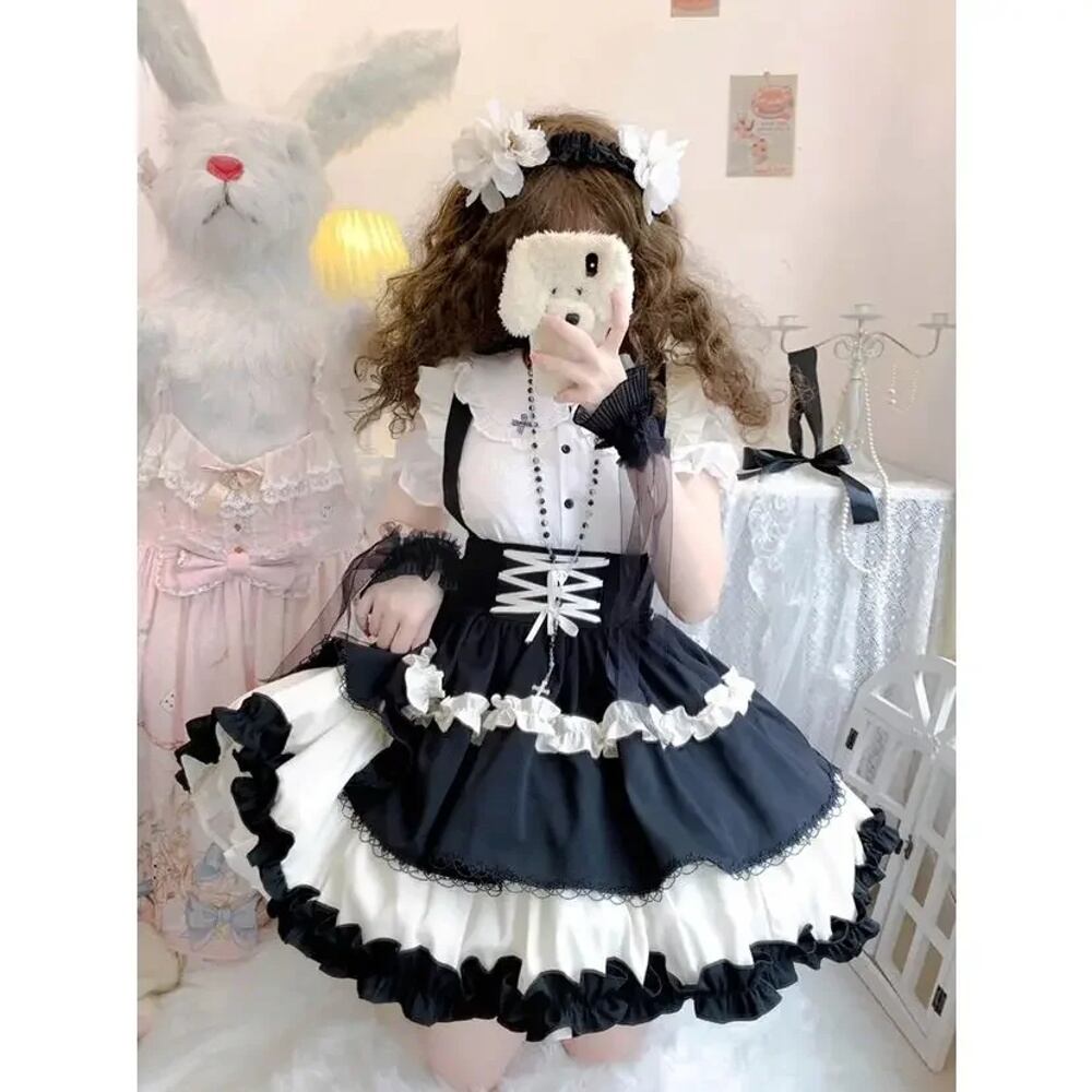 女性のための日本のカワイイロリータスカート、jsk y2k、small idol、ゴシック、ブラック、ショート、ソフトボウ、フリル、包帯、ハイウエストストラップスカート T240925143218_02