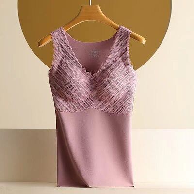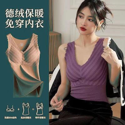 2024 人気 2枚セット カップ付きインナー ノーブラ保温衣レース Vネック レース保温ベスト キャミソール タンクトップ ヨガ 美背 レディース