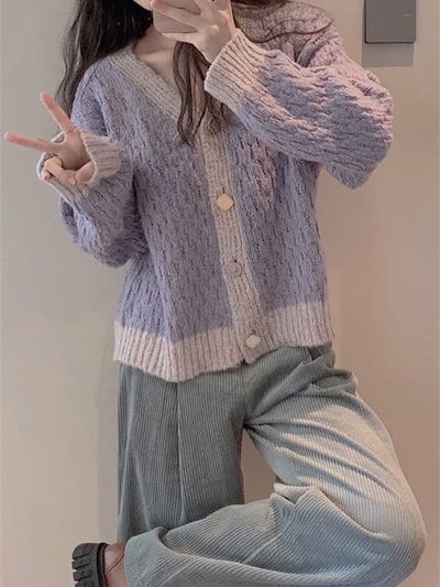 【 3日出荷 】カーディガン 2024 秋新カーディガン レディースファッション ムラサキvネックセーターコート秋韓系ゆるニットカーディガン ニットカーディガン アウター