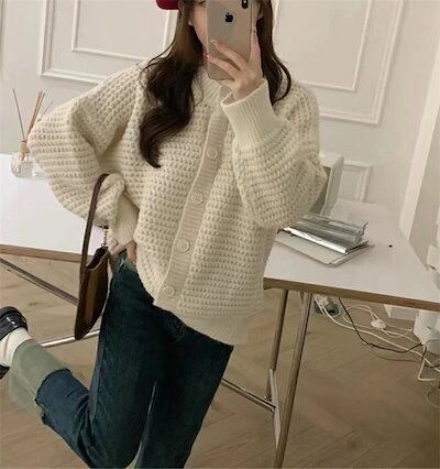 ニットカーディガン レディース ニット カーディガン 長袖 秋 冬 羽織り ざっくり編み 前開き セーター カットソー ケーブル編み ニットカーデ アウター ゆったり ミディアム丈 無地 クルーネッ