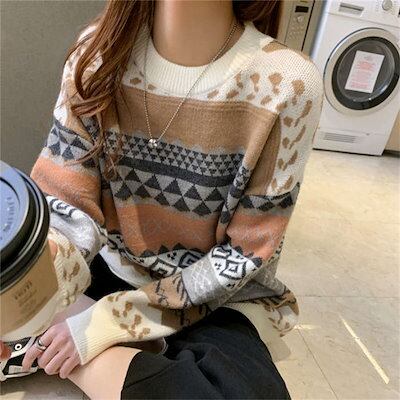 リブ ニット レディース セーター オーバーサイズ トップス 長袖 中厚手 ミディアム丈 きれいめ お洒落 可愛い 総柄 カジュアル ガーリー フェミニン ヴィンテージ レトロ オフィス ドロップショ