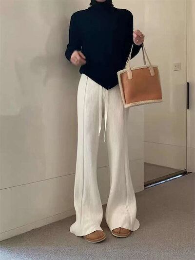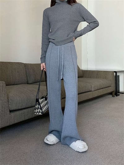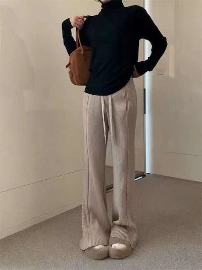 ニットパンツ レディース 秋 冬 リブパンツ ワイドパンツ リブ リブニットパンツ ウエストゴム ストレートパンツ プリーツパンツ リブニット パンツ 可愛い ゆったり リラックスパンツ ボトムス 無
