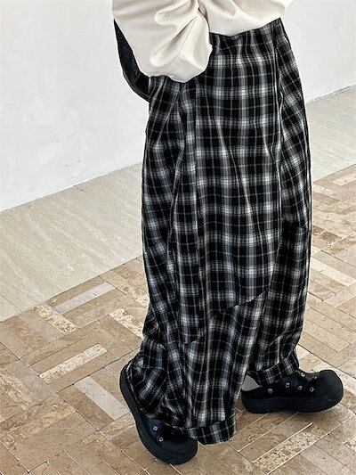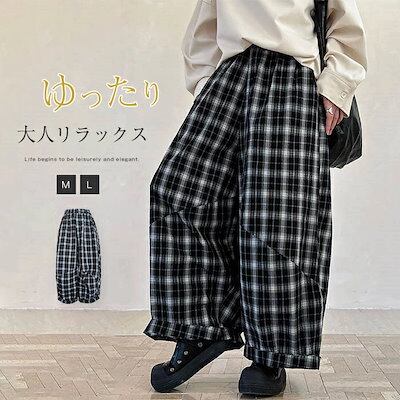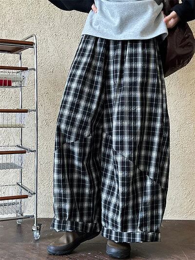 ワイドパンツ チェック柄 レディース 春 秋 ガウチョパンツ ワイド バルーンパンツ リラックス カジュアル きれいめ ボトムス ワイド ロング ズボン 切り替え 体型カバー 大きいサイズ ウエストゴ