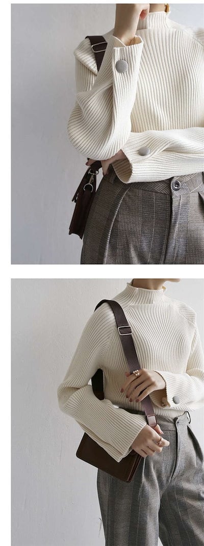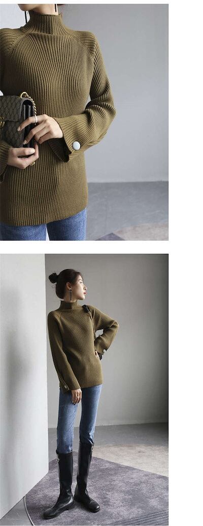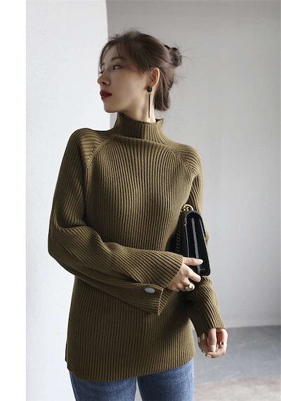 ニット レディース 袖ボタン ハイネック ニット タートル リブ フレアスリーブ プルオーバー 秋 冬 トップス 長袖 ゆったり ニットセーター 無地 リブニット 通勤 着痩せ 4色 30代 40代
