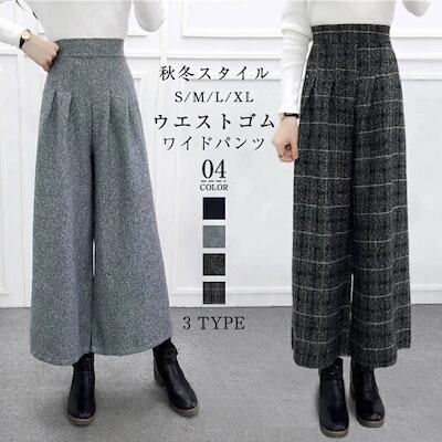 ワイドパンツ 秋冬 冬 レディース 綿混 ウエストゴム ハイウエスト ロング OL 通勤 オフィス 無地 チェック柄 デーリー
