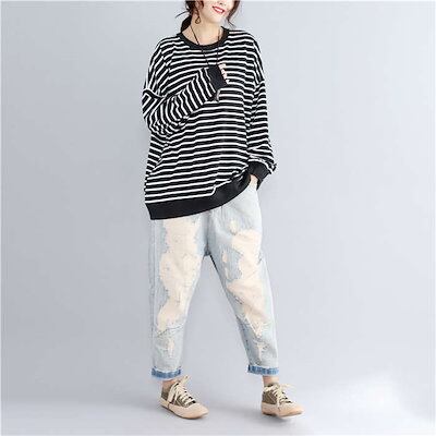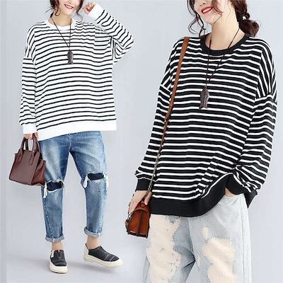 ボーダービッグプルオーバー スウェット プルオーバー レディース トップス カットソー 春 スウェット トレーナー ボーダー 丸首 長袖 パーカー 大きいサイズ ゆったり 綿混 コットン混 春秋 プル